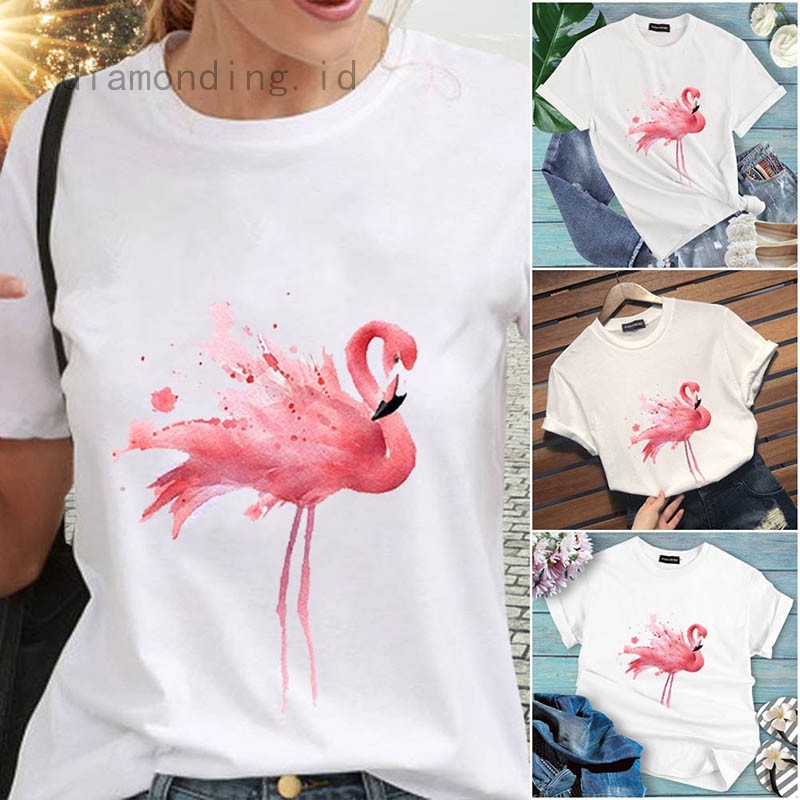 Kaos T Shirt Wanita Lengan Pendek Dengan Kerah Bulat Dan Gambar Kartun Flamingo Warna Putih Shopee Indonesia